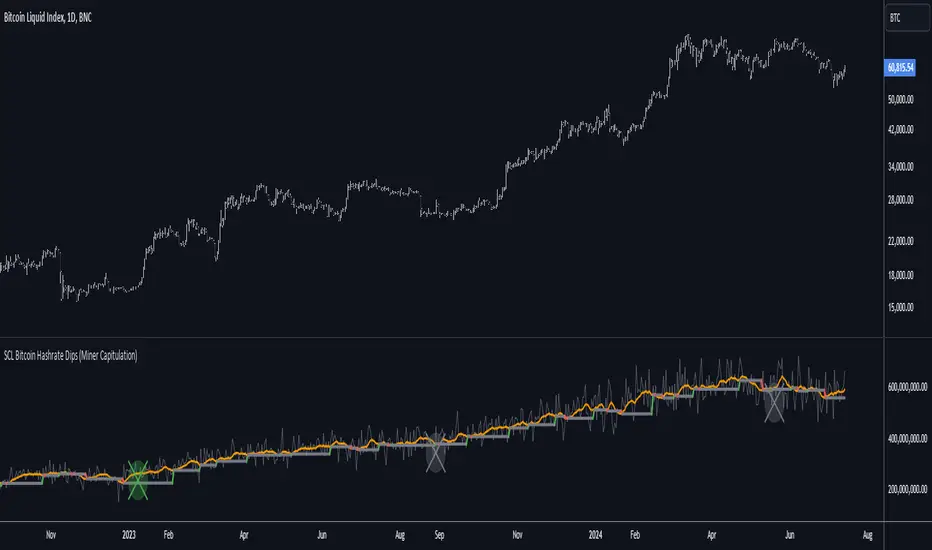 Gives long-term buy signals for Bitcoin from dips and recoveries in the hashrate (the "miner capitulation" theory). It has an overlay and a standalone mode and is fully configurable. It uses Williams Lows and ATR instead of moving averages.