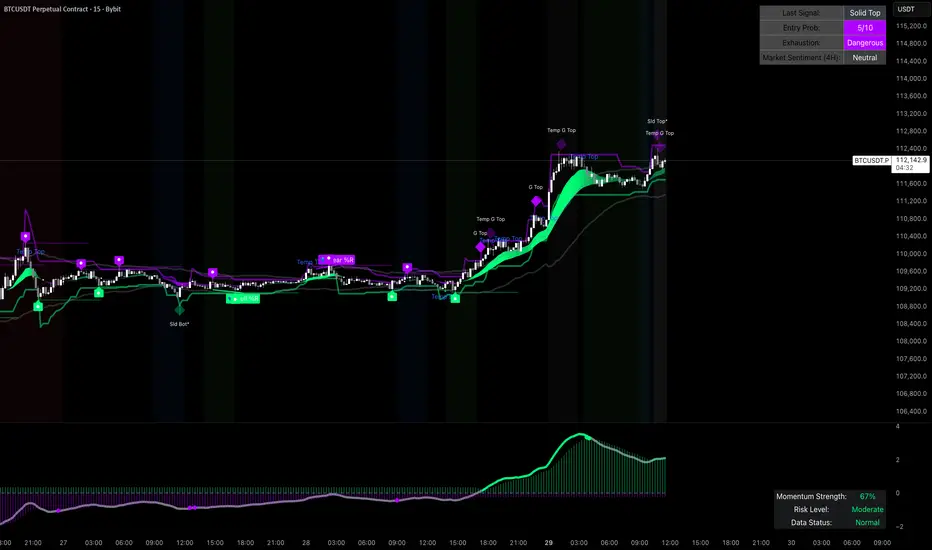 This indicator, HyperOscillator, is an enhanced oscillator designed to measure synthetic momentum by averaging percentage changes across multiple moving average periods. It provides a clear view of trend strength with a main line that turns green for bullish momentum and purple for bearish, alongside histograms for upper and lower bounds to spot crossovers. Exhaustion points are highlighted with circles for potential reversals, and you can enable divergence labels to detect regular or hidden mismatches between price and momentum. Volume weighting amplifies signals in high-activity bars, while multi-timeframe support brings in higher TF data for better context. The dashboard shows momentum strength as a 0-100% rank, risk level for overbought/oversold, and a flat data warning. Customize scales and styles to fit your chart, and pair it with HyperChannel for spotting exhaustion at channel edges. Not financial advice—experiment and see how it boosts your trading!