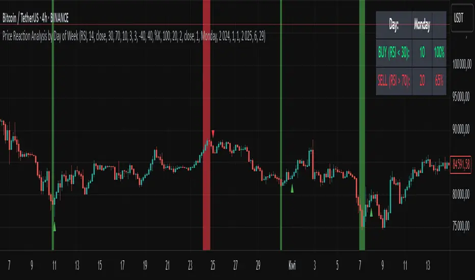 The "Price Reaction Analysis by Day of Week" indicator is a tool that enables traders to analyze historical price reaction patterns to technical indicator signals on a selected day of the week. It examines price behavior on a chosen candle (from 1 to 30) in the next day or subsequent days after a signal, depending on the timeframe, and provides success rate statistics to support data-driven trading decisions. The indicator is optimized for timeframes up to 1 day (e.g., 1D, 12H, 8H, 6H, 4H, 1H, 15M), as the analysis relies on day-of-week comparisons. Lower timeframes generate more signals due to the higher number of candles per day.