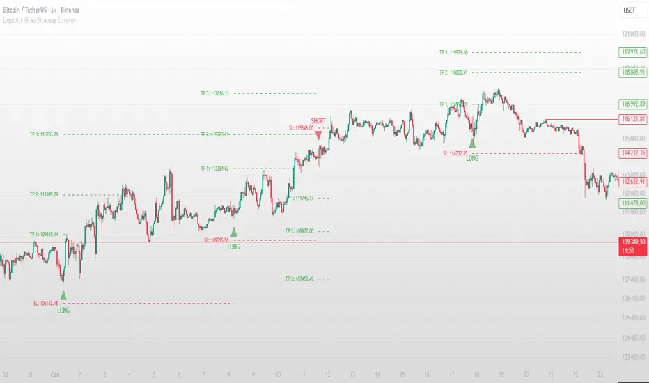 Entry Signals: Generates BUY/SELL signals after a liquidity sweep and a confirmed reversal — based on price action, volume, or structure shifts.