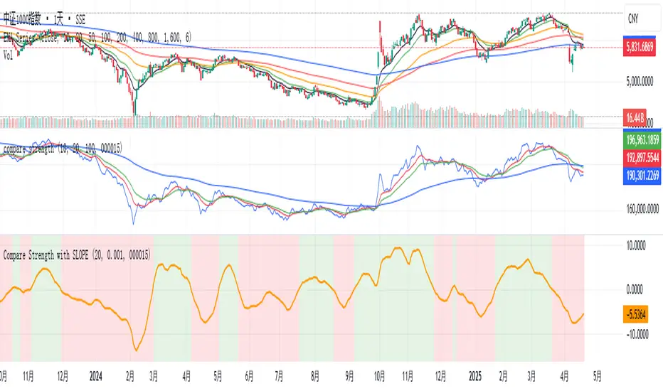 Indicator: Compare Strength (Slope-based)This TradingView indicator compares the relative strength between the current chart asset and a selected benchmark asset. It uses the slope of the log-transformed ratio of the two price series to identify trend bias.