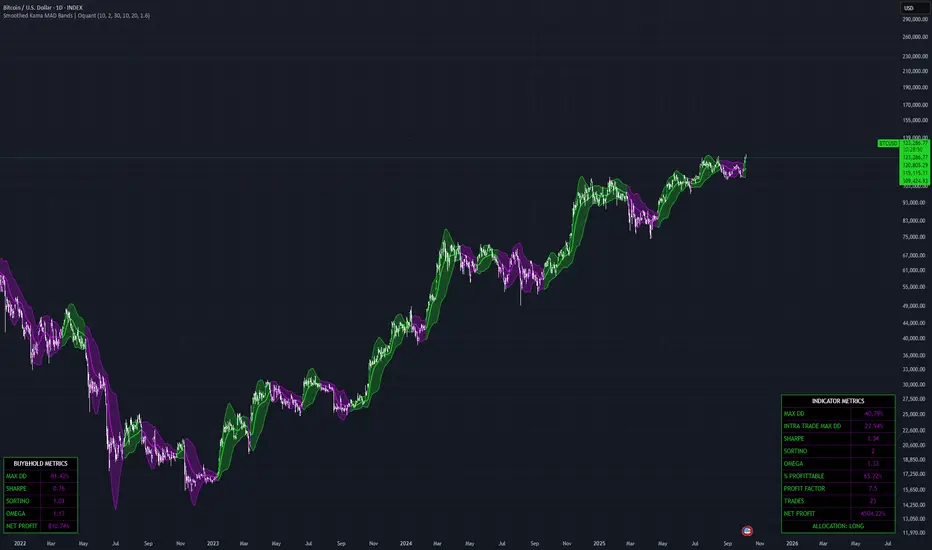The Smoothed KAMA MAD Bands indicator is an tool designed to help traders identify potential trend directions while incorporating volatility-based boundaries. It builds on the Kaufman Adaptive Moving Average (KAMA) concept by adding a smoothing layer and pairing it with Mean Absolute Deviation (MAD) bands to create dynamic bands. This combination aims to filter noise in ranging markets and highlight momentum shifts, with built-in position signals for long or short allocations. Additionally, it calculates key performance metrics to compare the indicator's historical behavior against a simple buy-and-hold approach(Remember past performance doesn’t guarantee future results).