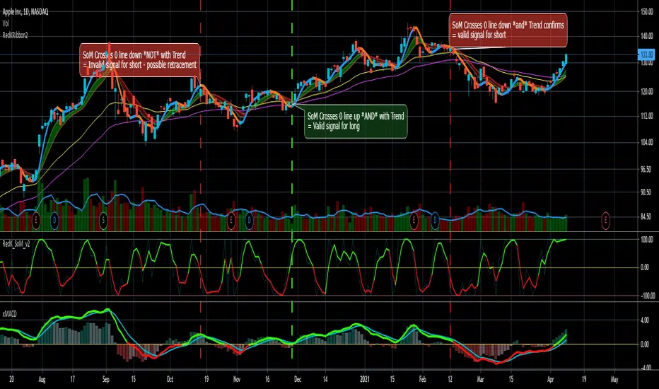 these setups will happen when the SoM reaches 100% (in either directions) while it's in agreement with the prevailing trend (hence the need to use the SoM with a MACD or something like the Ribbon) - if the SoM hits the 100% in one direction and the trend is not in the same direction, that signal is invalid. see the chart for some examples.