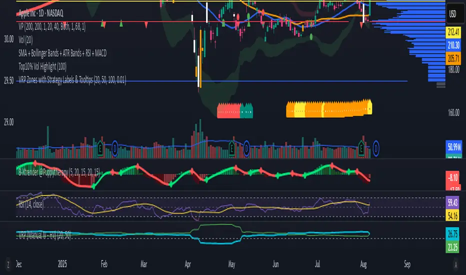 This script marries the core concept of Volatility Risk Premium—how far implied vol sits above or below realized vol—with practical, on-chart signals that guide you toward specific options trades. By seeing “High VRP” in orange or “Negative VRP” in red right on your price bars (with hover-for-tooltip strategy tips), you get both the quantitative measure and the qualitative trade idea in one glance.