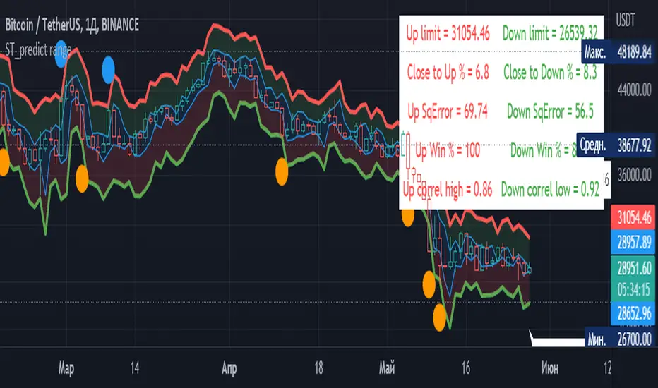 The upper and lower limits are determined with a confidence probability of 0.95. The places where the lows and highs go beyond their limits are marked with colored circles above and below the candles. In the upper right corner there is a summary table of the indicator metrics, which contains the following metrics: 1. current upper and lower limits 2. How much does the current price differ in % from the upper and lower ranges 3. A metric that considers the standard error between the limits of the indicator and the highs and lows 4. The percentage of accuracy of the indicator 5. The correlation coefficient between the upper and lower limit and, respectively, the maxima and minima