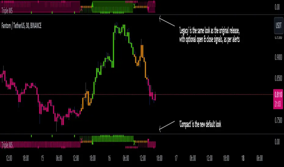 New look 'n feel, for those of you who prefer green on top and red underneath. This may seem more logic, or fit in better visually with other oscillators you use.Also, added visual signals by default, indicating trade direction position open and close.