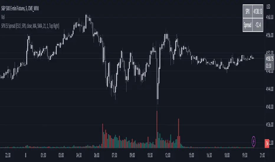 A very simple indicator to display the spread between ES and SPX. The table by default displays in the upper right corner of the chart. If you are on the chart for SPX, it will show the current price of ES, as well as the difference in points between the two. Similarly, if on the chart for ES, it will show the price for SPX as well as the difference in points between the two. The table does not appear at all if the chart symbol is anything other than ES or SPX. The specific symbols used can be defined by the user.