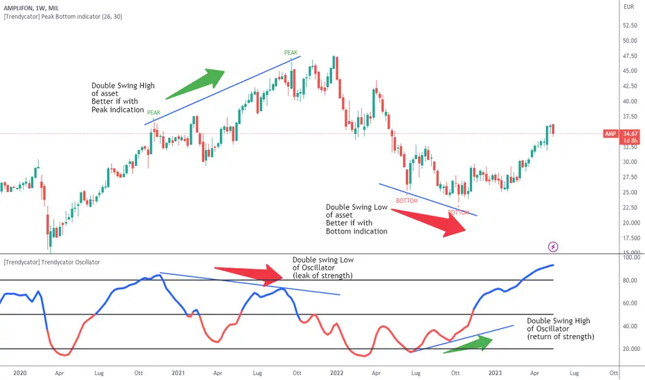 Normally can be used together with Peak and Bottom indicator but, can be used as well alone looking for swings.
