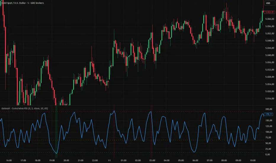 stelaraX – Cumulative RSI is a mean-reversion momentum indicator designed to amplify short-term RSI extremes by summing multiple consecutive RSI values. By accumulating RSI over a defined number of bars, it highlights sustained overbought or oversold pressure rather than isolated single-bar extremes.