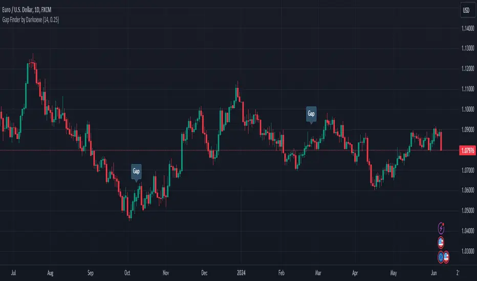 This indicator plots labels that indicate gaps whenever the open price and the previous bar close price have a significant gap.To determine the size the gap has to be before it is labeled at a specific point in time on the chart. The gap needs to be larger or equal to a factor of an ATR value of the previous candle. For example, if the ATR gap factor is 0.25, the gap between the open and the previous close price must be greater than 0.25*ATR of the ATR length specified for the gap to be plotted on the chart.