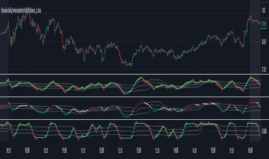 • RSX: The Relative Strength Index (RSX) in this script is based on Jurik’s RSX, which is smoother than the traditional RSI and aims to reduce noise and lag. This script calculates the RSX using an exponential smoothing technique and adaptive adjustments.
