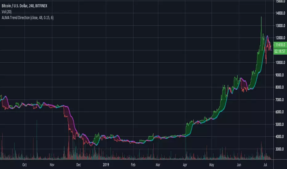 The low price for each candle is then compared to the ALMA. If the low is greater than the ALMA, then there is a bullish trend and the area between the candles and ALMA is filled green. The area between the ALMA and candles is filled red when the low price is less than the ALMA.