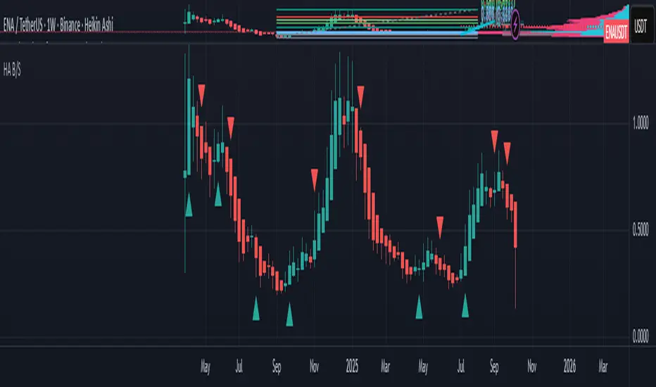 This indicator draws Buy and Sell signals on the current candlestick, based on a complete reversal pattern of the previous three Heikin Ashi (HA) candlesticks: