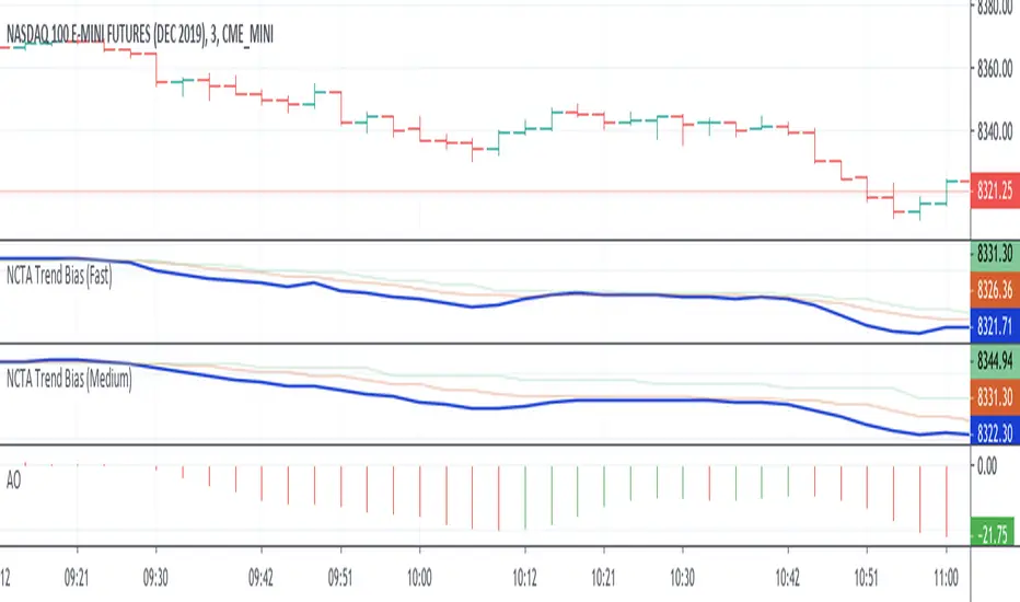 The NCTA Trend Bias indicator is designed to show traders the overall directional bias of the market. It is excellent in short 1, 3, and 5 minute timeframes for futures traders and short term options traders. Longer timeframes such as the 5, 10, and 30 minute timeframes work well for options traders.