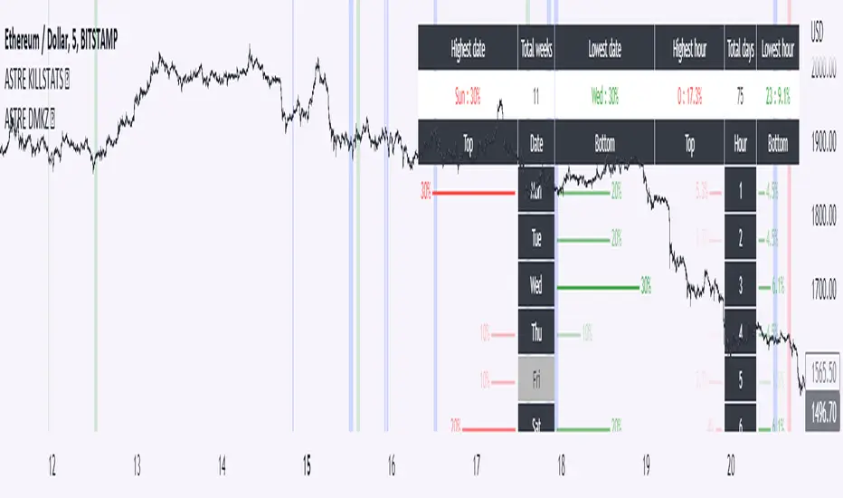 This indicator is to be used with "KILLSTATS", our indicator allowing to backtest on hundreds of days at which time, and which day the top/low of the day and week is formed.