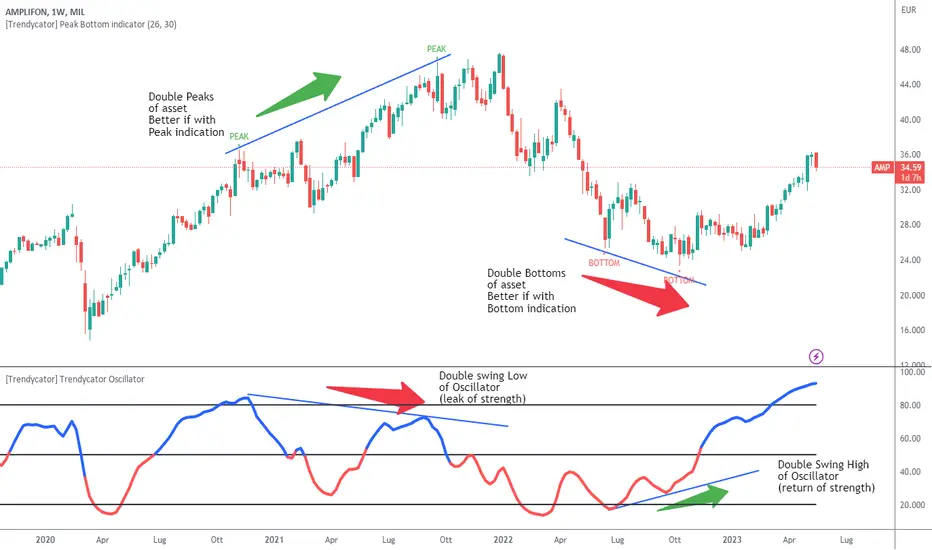 Peak and Bottoms are directly linked with Trendycator Oscillator: first because they are derived from Oscillator, and second because better usage is in union of two.