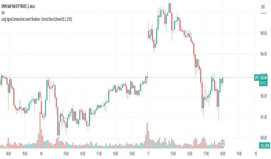 This script identifies and highlights consecutive lower shadows on candlesticks in TradingView. A lower shadow is the portion of the candlestick between the low price and the lower of the open or close prices, often indicating price rejection at lower levels.