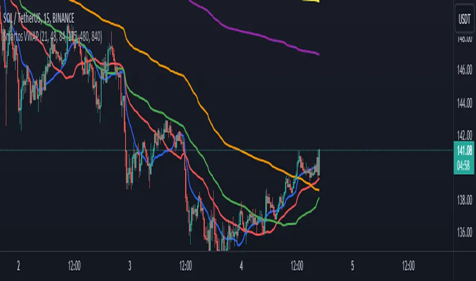 Customizable Periods: The indicator allows users to set six different candle lengths for VWAP calculations, with default values of 21, 48, 84, 175, 480, and 840 candles. Users can easily modify these values to suit their trading preferences.