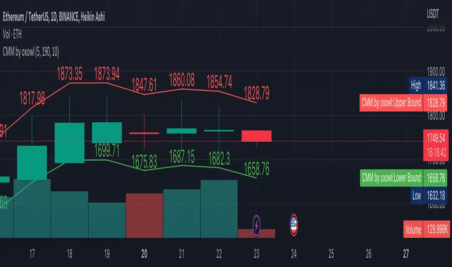 Concentrated Market Maker Strategy by oxowl. This script plots an upper and lower bound for liquidity provision, and checks for rebalancing conditions. It also includes alert conditions for when the price crosses the upper or lower bounds.