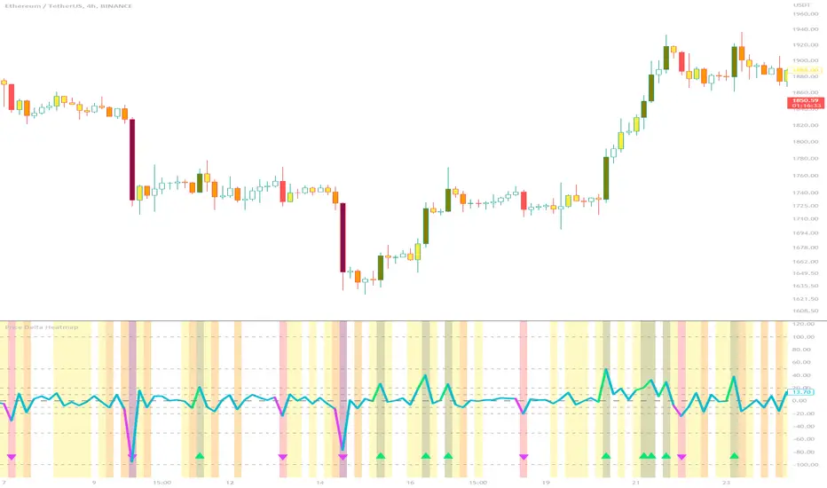 The Price Delta Heatmap is an indicator designed to visualize the price changes of an asset over time. It helps traders identify and analyze significant price movements and potential volatility. The indicator calculates the price delta, which is the difference between the current close price and the previous close price. It then categorizes the price deltas into different color ranges to create a heatmap-like display on the chart.
