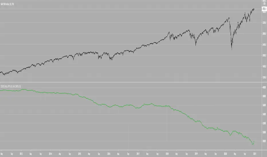 Just a simple script to subtract any two symbols giving a delta of the values, and then getting a cumulative sum of each bars delta value. The two default symbols are the Value of All Trades on Upticks for US Stocks, and the Value of all Trades on Downticks for US Stocks. There are a lot of possibilities with this. Delta is turned off by default, to turn it on you have to select "Show Delta" in the inputs.