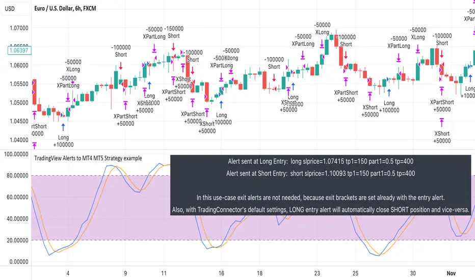 Another fresh feature of TradingConnector, is closing positions only partly - provided that the broker allows it, of course. A position needs to have trade_id specified at entry, referred to in further alerts with partial closing. Detailed spec of alerts syntax and functionalities can be found at TradingConnector website. How to include dynamic variables in alert messages can be seen at the very end of the script in alertcondition() calls.
