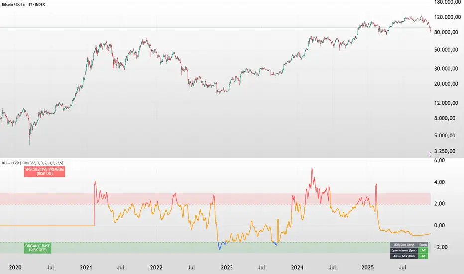 Concept inspired by the "Estimated Leverage Ratio" (ELR) popularised by CryptoQuant and analysts like Willy Woo. LEVR adapts this concept for TradingView by substituting Exchange Reserves with Network Activity for better reliability.
