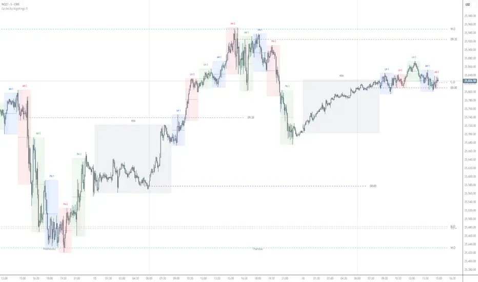 Cycles visualizes institutional time windows and key opening price levels. Instead of analyzing price patterns, this indicator segments the trading day into institutional order flow periods (90-minute, 30-minute, 10-minute cycles) and marks significant opening prices (session, daily, weekly, monthly, yearly) that often act as reference points for intraday price action.