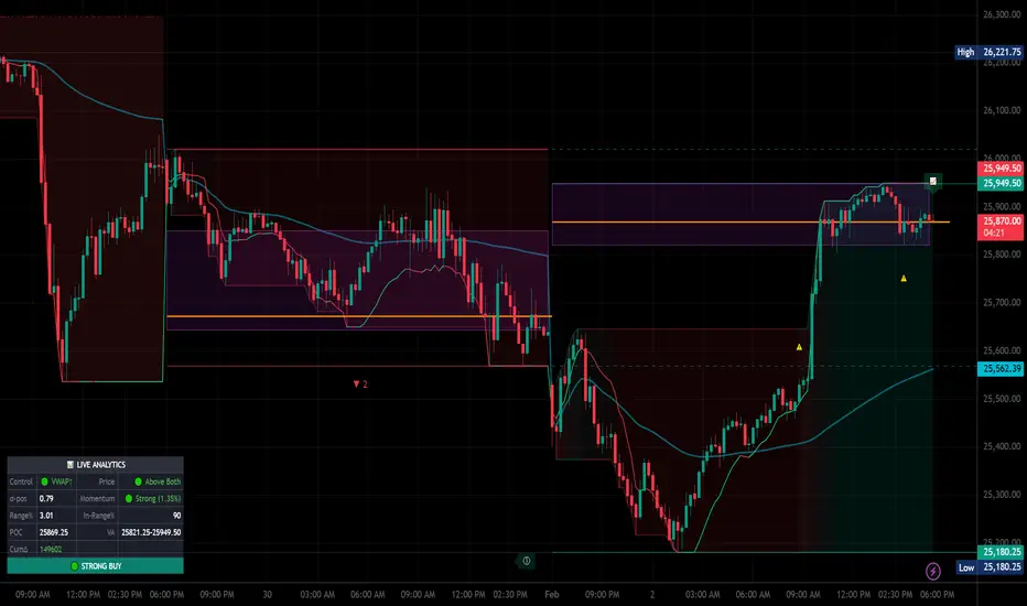 It’s a battlefield fence: it draws the session container, exposes auction control (VWAP vs TWAP), and layers context (trend state, momentum, delta, imbalances, POC/VA, patterns, Gann partitions) so price must prove acceptance/rejection before you act.