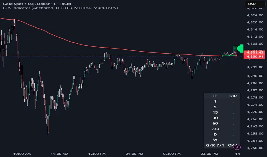 BOS Indicator (Anchored, TP1–TP3, MTF≥4, Multi-Entry)