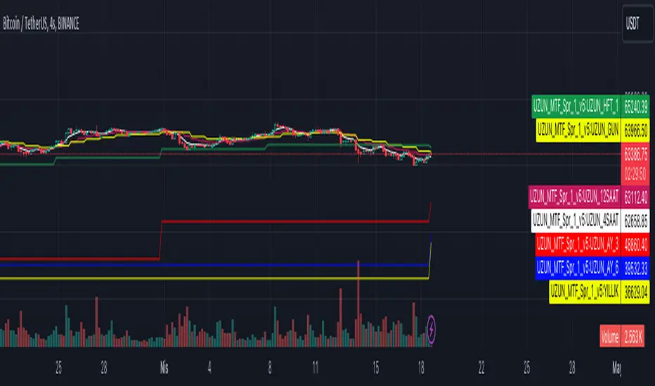 Bu Pine Script kodu, TradingView için tasarlanmış "MTF_Super" (Çok Zaman Dilimli Süper) adlı bir göstergeyi oluşturur. Birden fazla zaman diliminde (MTF) farklı uzunluklardaki üssel hareketli ortalamaları (EMA) çizer. Kullanıcılar 4 saatlik, 12 saatlik, 1 günlük, 1 haftalık, 1 aylık, 6 aylık ve 3 aylık gibi çeşitli zaman çözünürlükleri için EMA'ları seçebilirler.