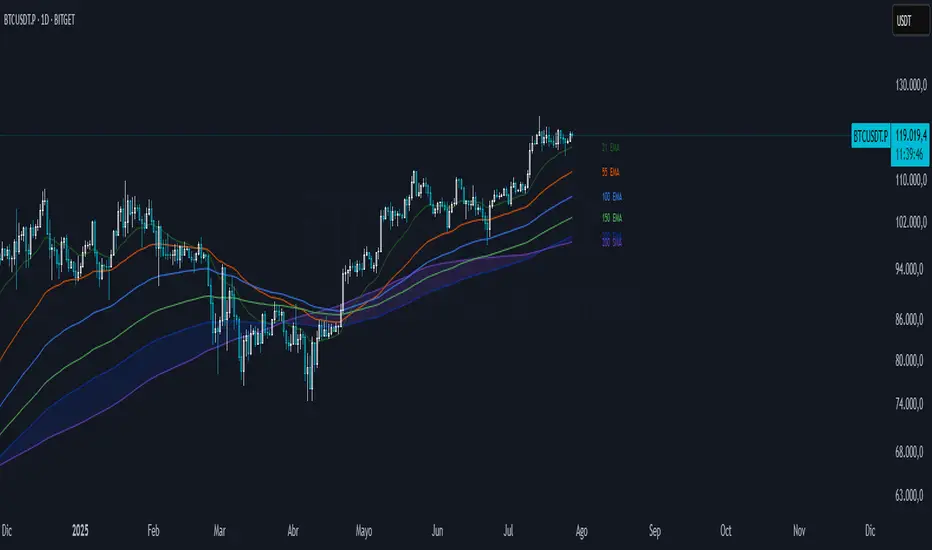 Conditional Fills: Optional translucent fills between adjacent MAs to highlight relative strength—green when the faster MA is above, red when below.