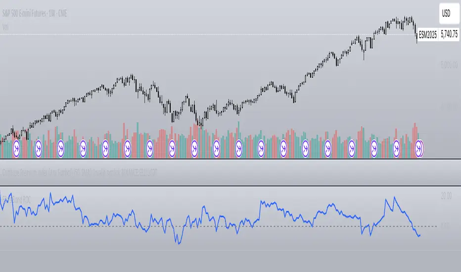 This Pine Script plots the Relative Rate of Change (ROC) between the S&P 500 E-mini Futures (ES) and 30-Year Treasury Bond Futures (ZB) over a specified period. It helps identify when equities are overperforming or underperforming relative to long-term bonds—an insight often used to detect risk-on/risk-off sentiment shifts in the market.