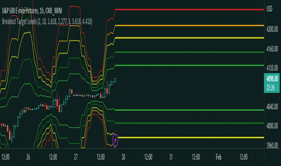 This indicator gets five levels of the Fibonacci Extension and uses it for both the low and the high. The default lookback period is 10 days, and it checks for the highest and lowest price in that period. Then it calculates the extension levels and plots them, and it also adds a line that shows you the current breakout target levels.