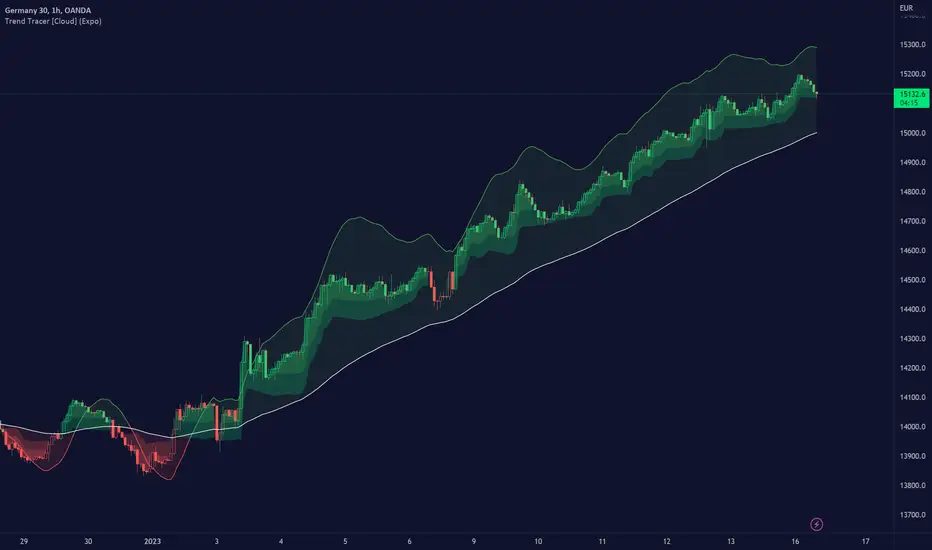 The Trend Tracer [Cloud] (Expo) indicator identifies and predicts the future market direction. The cloud is designed to make it easier to see when a market is trending in one direction or another and to help traders identify potential entry and exit points, as well as trend changes. It is a visual representation of the price's momentum, price action, and volatility by using the trend range in a cloud-like pattern. The bigger the cloud, the more momentum the price has.
