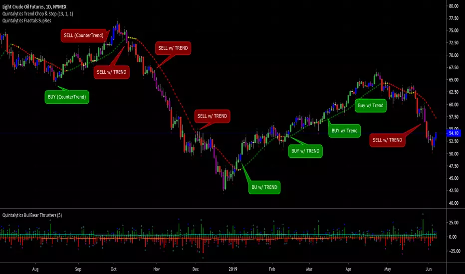 The presence of a BLUE/MAGENTA Signal Arrow (and associated Barcolors) can be used as criteria for trade entry, exit, or take profit conditions. These should not be used as the sole method of trading, but rather in conjunction with other indicators and trading strategies, as well as Trailing Stop Loss indicators such as the Quintalytics “Trend, Stop, and Chop”