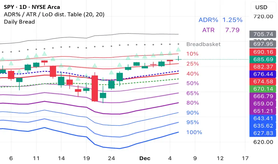 It is intended to be used for short term trading or long term investing with a daily market index chart such as SPY and multiple exchange traded funds that track said market index. A different ETF is purchased when a daily SPY candle reaches a lower buy band using 10% of a total account value. The sale of any ETFs is at the discretion of the trader and dependent on investment strategy (short term trading or long term inventing) and the trend. When short term trading in a downtrend or when daily candles are below the 50 EMA, selling would be done every 2 to 3 bands above a buy to mitigate the risk of a significant portion of an account getting caught in a downtrend. In an uptrend the High Band would be used to sell any holdings.