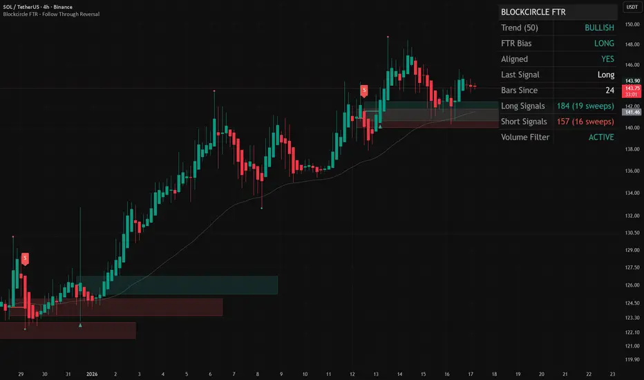 Blockcircle FTR identifies failed directional moves followed by quality reversals. The indicator tracks structural pivot levels, monitors price interactions with those levels, and validates reversal sequences against a configurable threshold.