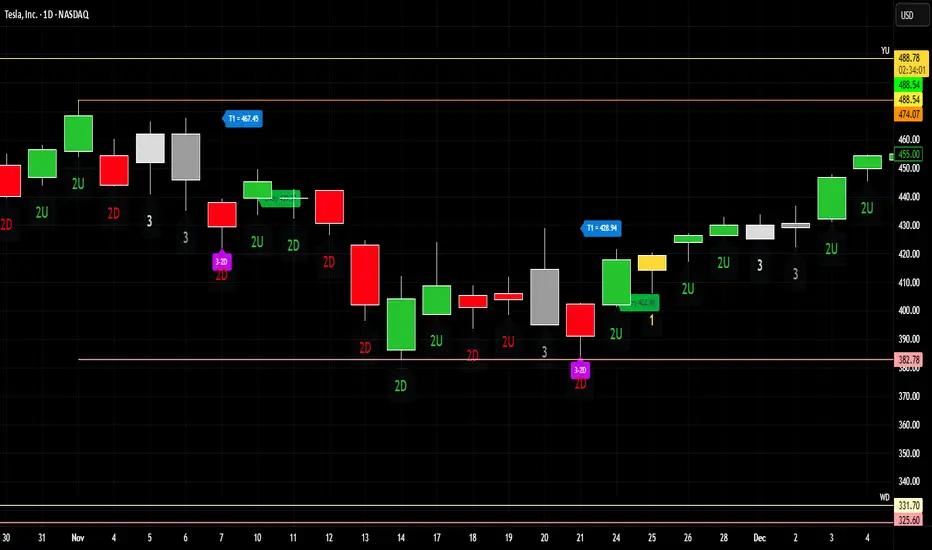 This is an indicator that identifies the 3-2D setup & will alert you if you have this on the chart. Once the 3-2D setup happens this will give you the entry and target labels + price. You can change the font size, label colors and add optional alerts.