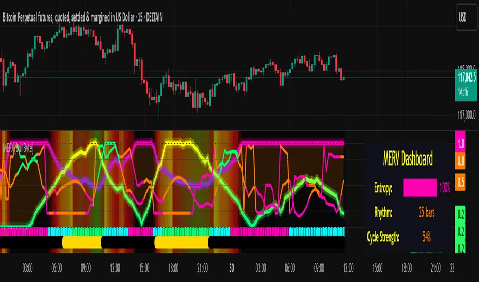 The MERV (Market Entropy & Rhythm Visualizer) indicator analyzes market conditions by measuring entropy (randomness vs. trend), tradeability (volatility/momentum), and cyclical rhythm. It provides traders with an easy-to-read dashboard and oscillator to understand when markets are structured or choppy, and when trading conditions are optimal.