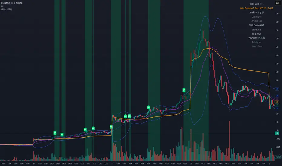 The Microstructure Pressure Index (MPI) Burst Regime indicator detects rare, clustered volume bursts (Percentile + Z-score), converts them into an MPI (% of bursts over a rolling window), then signals and shades short-term up-pressure regimes only when structural filters (VWMA slope, Close > VWMA / Bollinger Upper) align. Includes Anchored VWAP end-detector to spot regime neutralization.