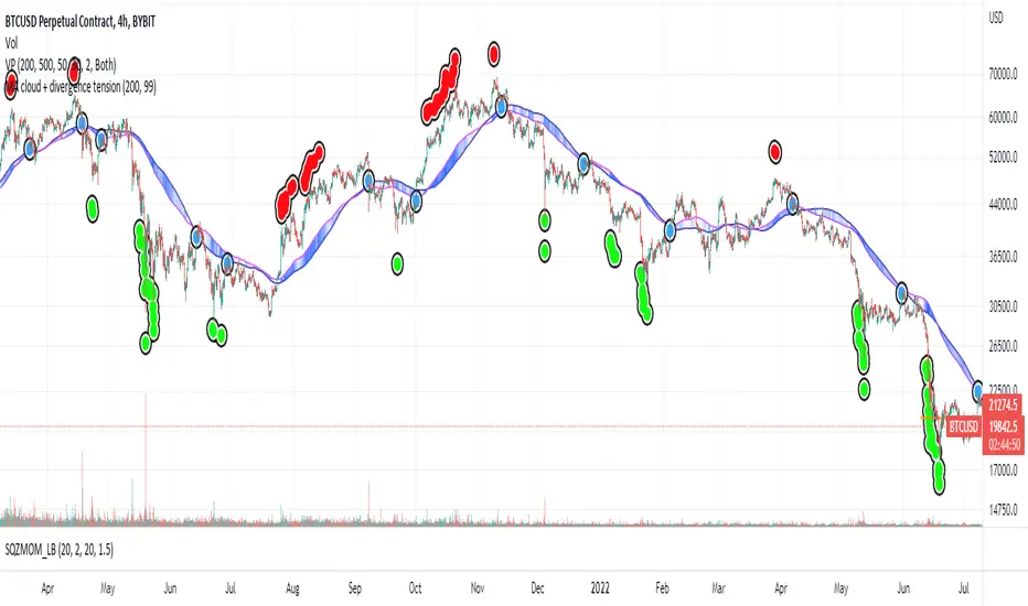 These signal maximum tension between the price and the moving averages. Though when I say maximum, I'm only referring to the historic range! As you can see, often price diverges even further and so more signals are placed. But usually, this tension is resolved, either by the MA cloud moving towards the price or the price moving towards the cloud. With confluence from other indicators, these could be good points to start taking dollar cost averaging, or start taking profits.