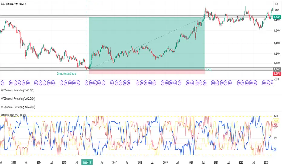 To show the practical application, here’s a breakdown of a Gold (GC1!) trade that leveraged both COT Index and COT Net Positions to identify a high-probability setup.