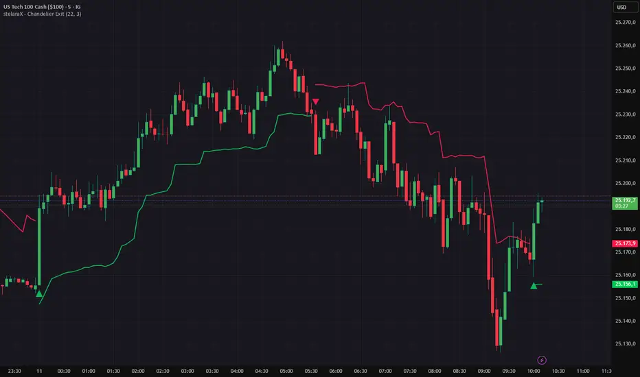 stelaraX – Chandelier Exit is a volatility-based trailing stop indicator designed to lock in profits while allowing trends to develop. By anchoring stop levels to recent highs or lows and adjusting them with ATR, it adapts dynamically to changing market volatility.
