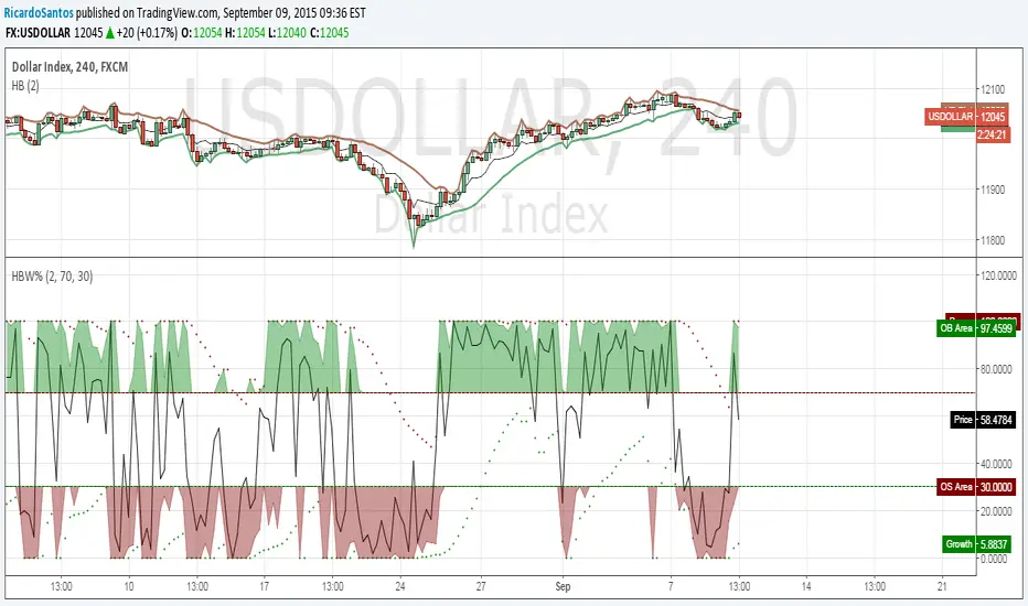 Same concept as Bollinger Bands Width % applied to Hull Bands.