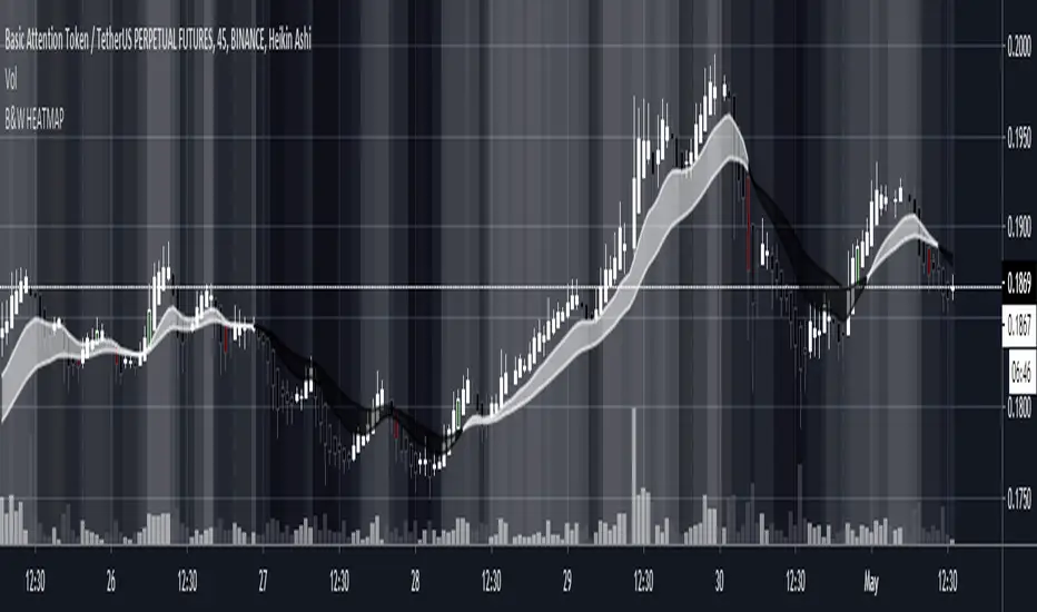 A Black and white heatmap (you can change to any colors in settings) overlay for better trend analysis. Use the crossovers to determine directional bias. Can be used with any other MA cross, baseline, or trendline strategies to help decide if a trade is worth taking. The gradient from black to white represent the strength of the trend . Black = Downtrend, White = Uptrend, Gray=range/chop. Candle colors indicate potential Long/Short