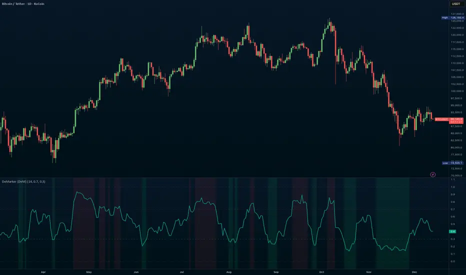 The DeMarker (DeM) indicator is a momentum oscillator designed to identify overbought and oversold conditions by comparing the most recent price extremes (highs and lows) to those of the previous candle. It moves between 0 and 1 and is especially useful for spotting potential trend reversals, exhaustion, and better-timed entries within larger trends.