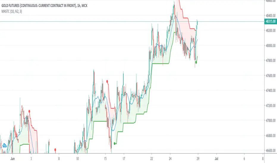 This MASTC indicator is a combination of Moving Average & Supertrend with default value of 10 & 10,3.