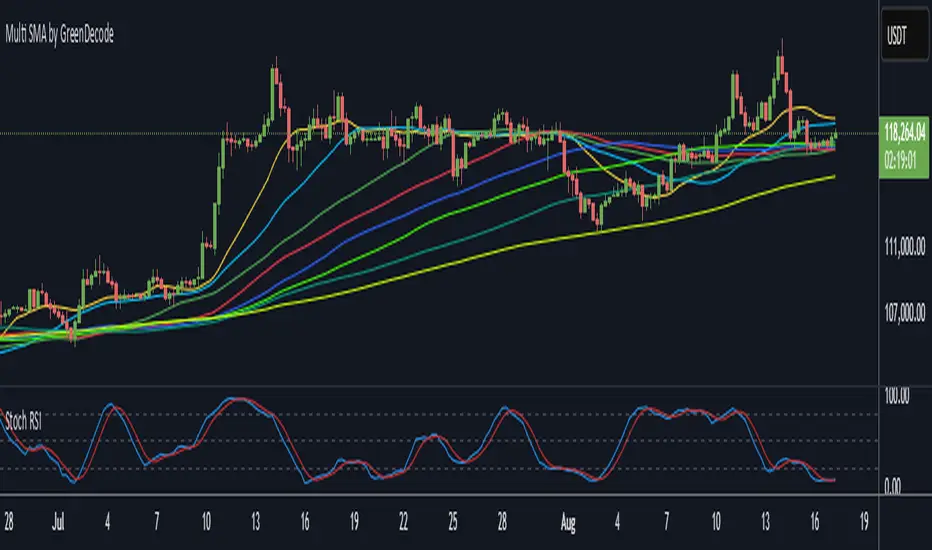 This indicator, created by GreenDecode, plots eight Simple Moving Averages (SMAs) with customizable lengths and resolutions. Each SMA can be toggled on or off, and the colors are distinctly set for easy identification: SMA1 (yellow), SMA2 (cyan), SMA3 (green), SMA4 (red), SMA5 (blue), SMA6 (lightblue), SMA7 (teal), and SMA8 (gold). The SMAs are calculated to avoid repainting by using the 'lookahead=barmerge.lookahead_off' parameter, ensuring historical accuracy. Ideal for technical analysis to identify trends and potential reversal points on various timeframes.