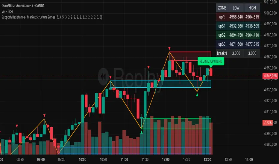 It finds swing highs and swing lows (pivots) and uses them to build market structure. From that structure, it identifies the current regime (Uptrend, Downtrend, Transition, or Range) and then plots the most relevant zones (main levels plus optional flip/historical levels) as colored boxes.